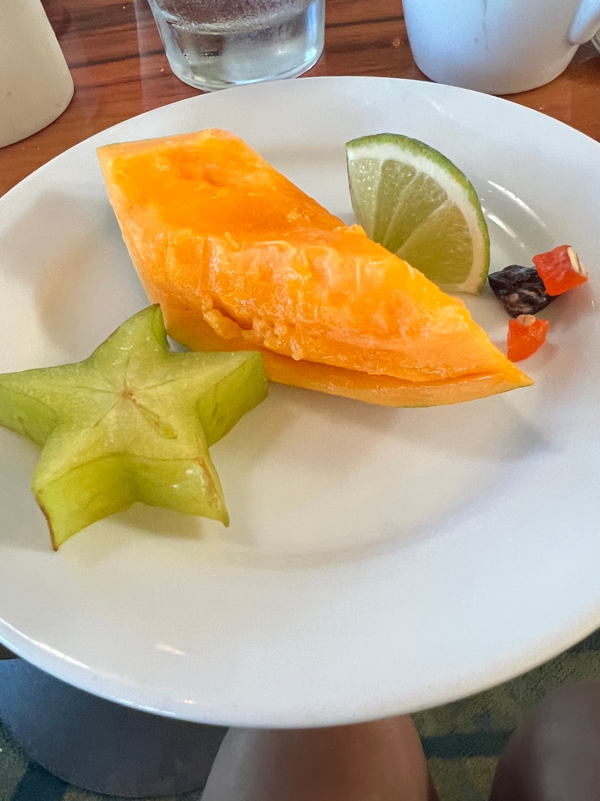 Ru dodges breakfast, still not feeling foody. Sazi is feeling a bit off this morning, too but has a simple off-menu breakfast from Juanito who goes way over the top and then some, fussing over us in compensation for all things the staff had done wrong yesterday. On top of breakfast, he gives us takeaway coffee and a complimentary Hawaiian donut. Everyone is smiles.